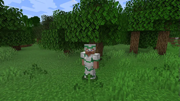 Minecraft Steve wearing iron armor trimmed with emerald.
