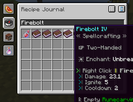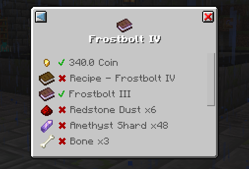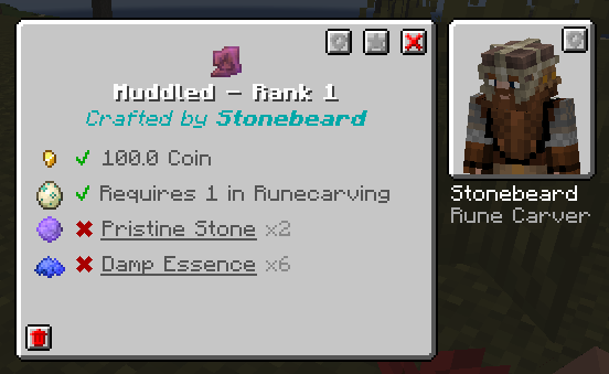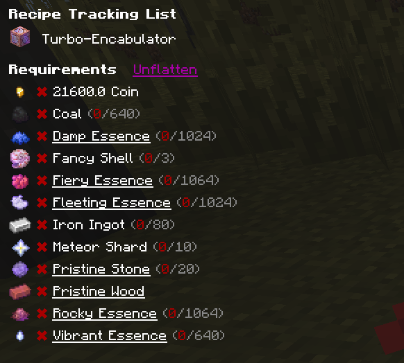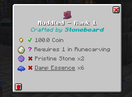 An example of a stored recipe. Includes the NPC, cost, required conditions, and ingredients needed to craft.