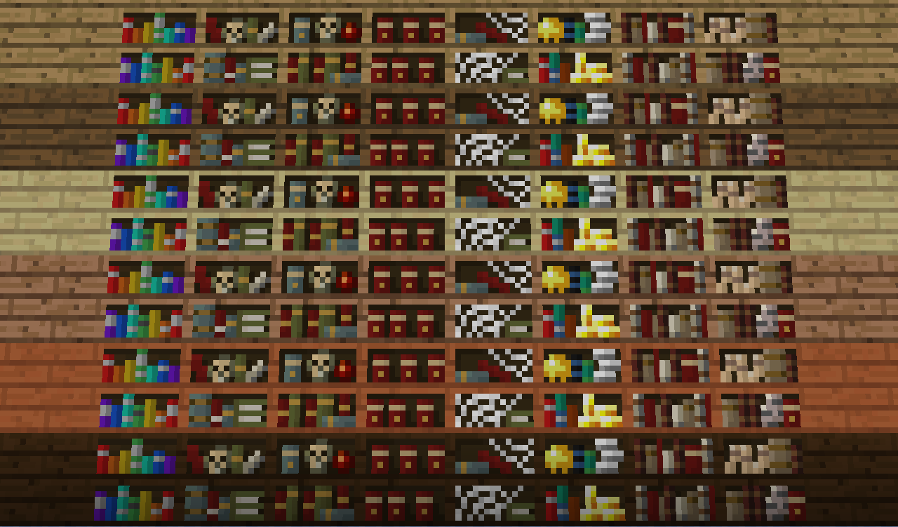 Chisel adds several Bookshelves, available in all 6 wood types. They are even usable with the Enchantment Table.