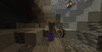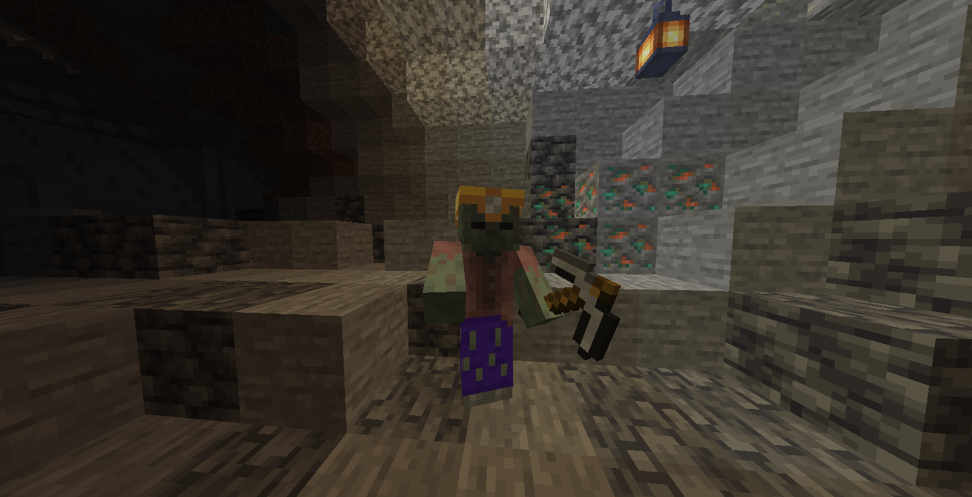 A prosperisher in a cave, near a lantern hanging from the cave roof