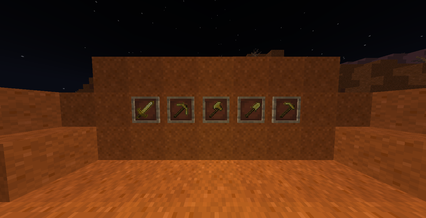 The full toolset of Reinforced Gold Tools in a badlands biome at night