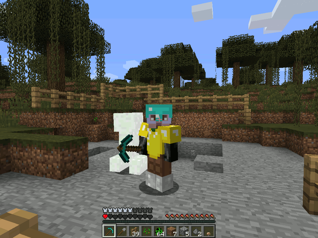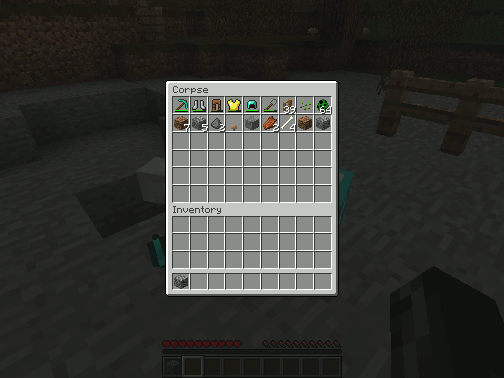 The corpse is wearing my armor and holding my pickaxe.