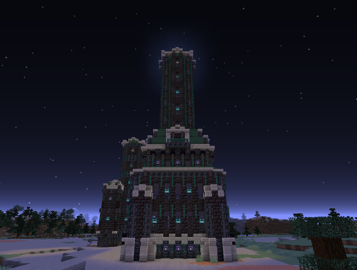 A castle built with Cinder Bricks, Industrial Iron, and Large Lanterns