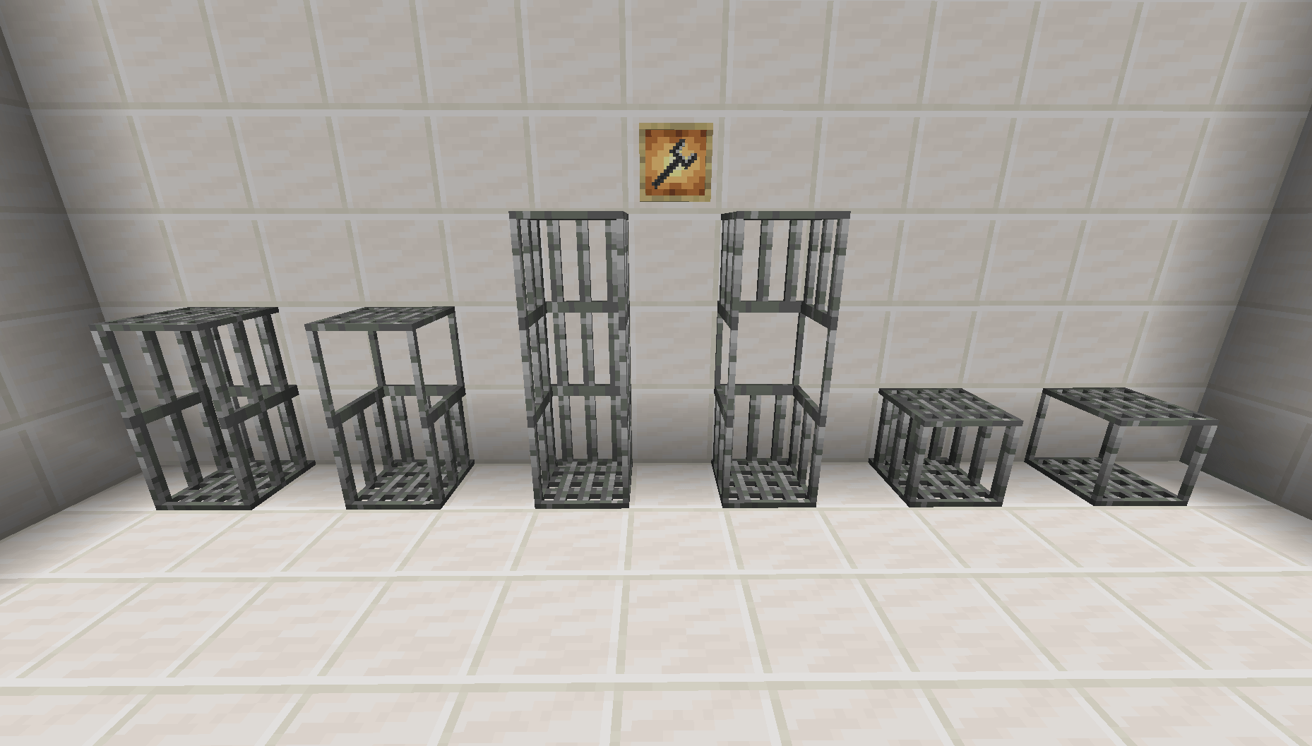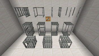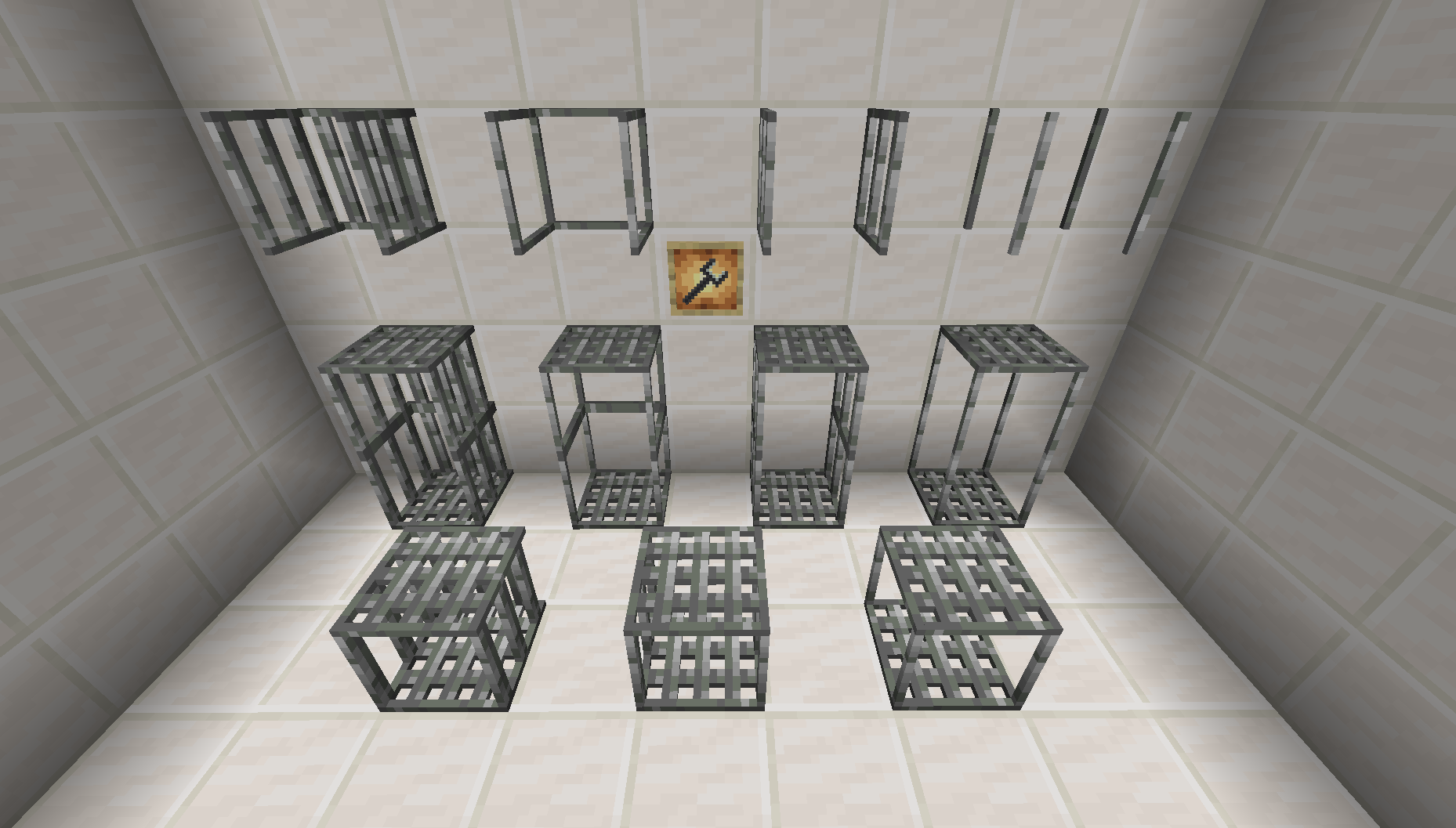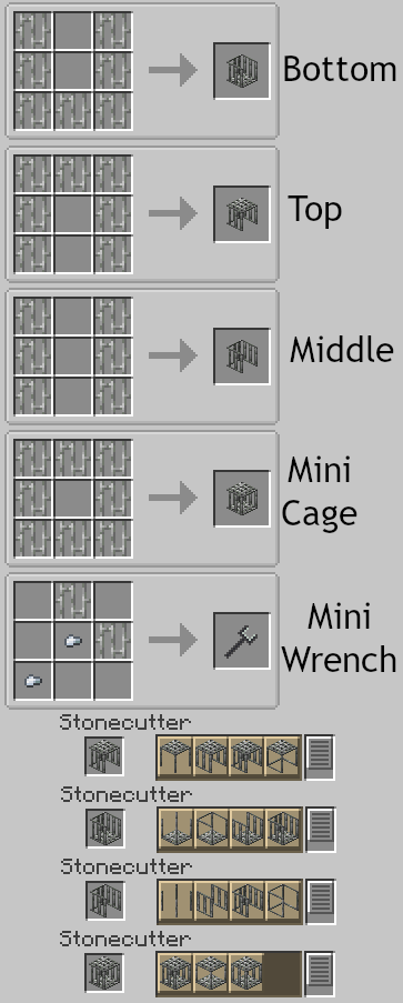 A showing of all the blocks in the mod, and the mini-wrench in an item frame. From left to right: Standard Cage, Open Cage, Sided Cage, and Fully Open Cage. Miniature versions in front: Standard, Sided, and Open.