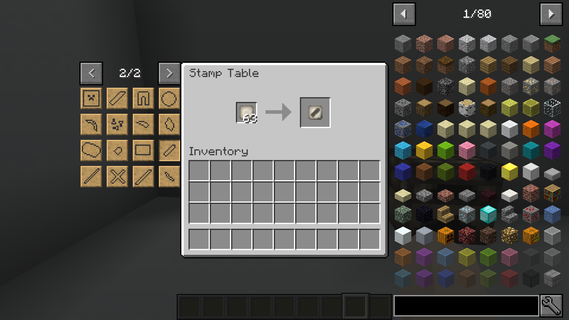 The interface of the Stamp Table. Put a raw stamp into the left slot, select a stamp from the left and get a raw stamp