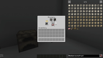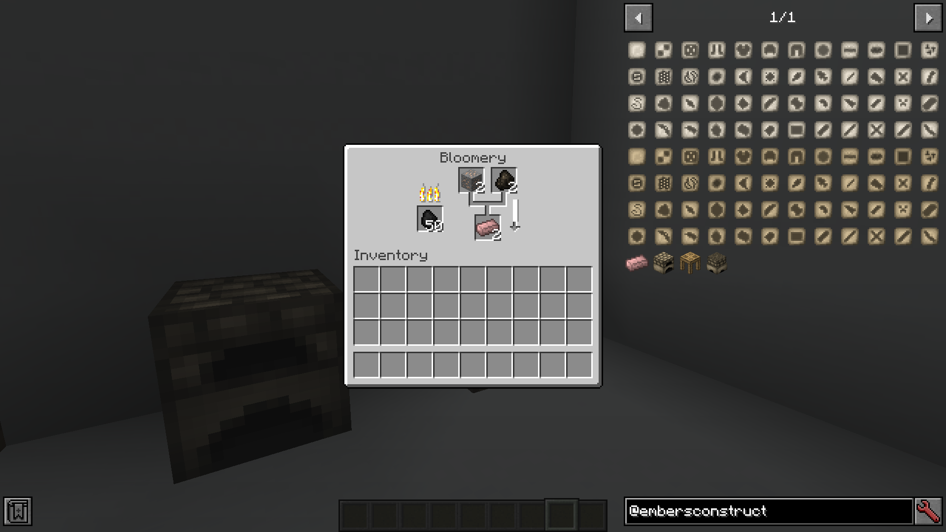 The Interface of the Bloomery. The Slot on the left is the fuelslot, put coal there. The two slots at the top are the inputslots, put charcoal and iron ore there. The slot beneath the inputslots is the outputslot