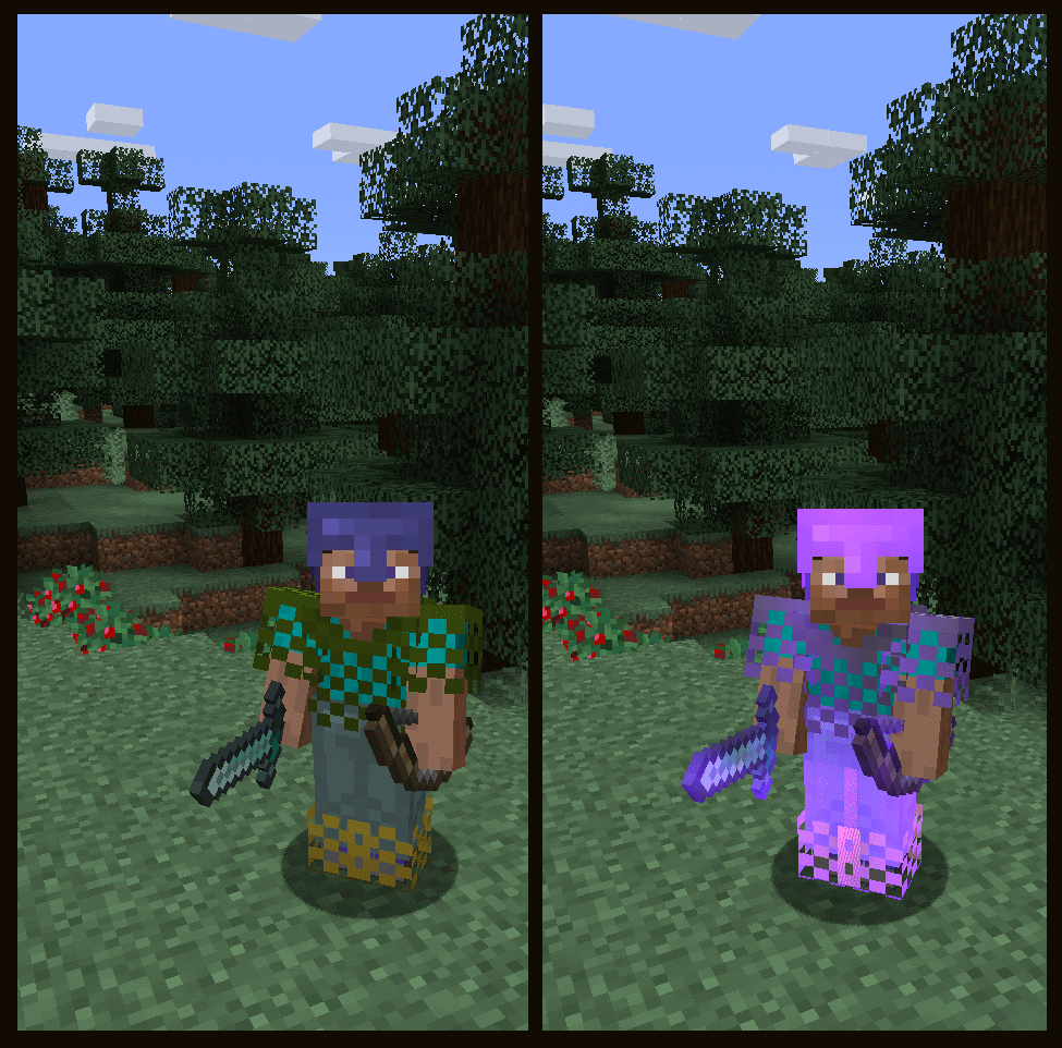 Now with Bows and Diamond Swords. You can't dye them but you can hide the glint with a right click Just like Armor! Identical gear on the left and right. Easily turn on and off Enchantment Glint by right clicking on the equipment item.