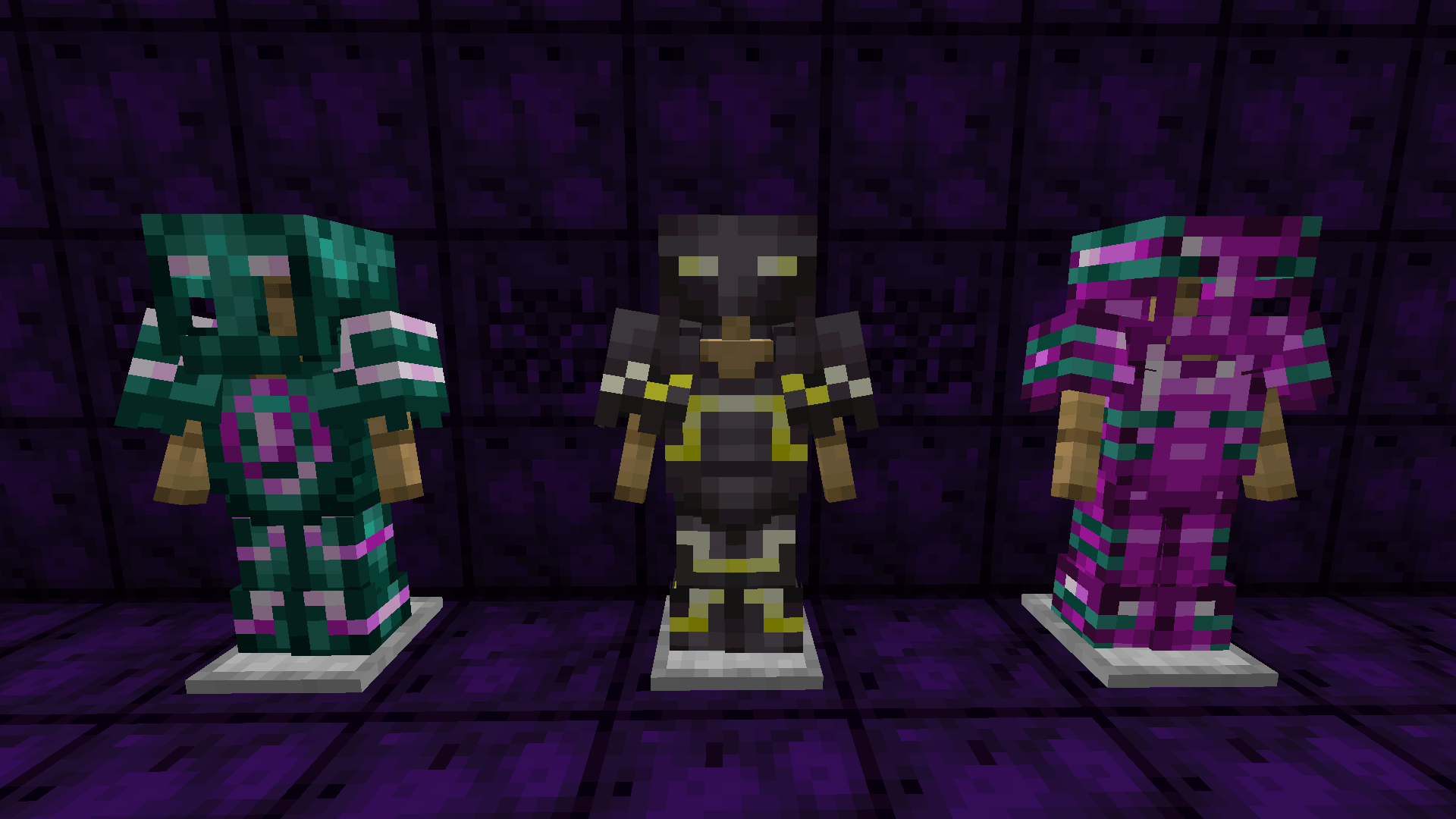 Enderite Armor with Orichalcum trim, Netherite Armor with Titanite trim and Orichalcum Armor with Enderite trim