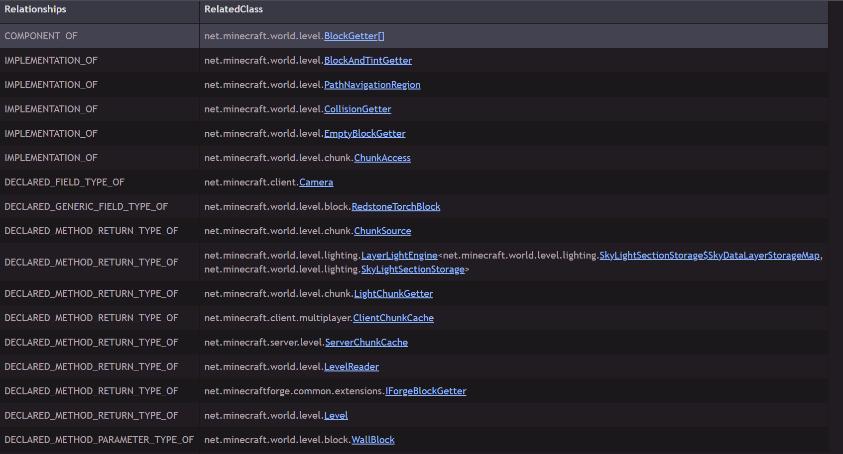 All classes have relationships, whether they are dependencies of other classes, or they depend on other classes. This table is on every clas page and details that information.