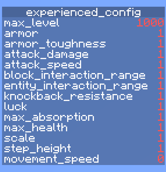 The experienced_config scoreboard to help in the configuration of the datapack.