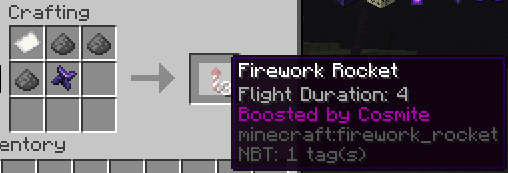 A Crafting Table interface with the following items in it: 1 Paper, 3 Gunpowder, 1 Cosmite. The output is 3 Firework Rockets with a flight duration of 4 and the additional tooltip line "Boosted by Cosmite".