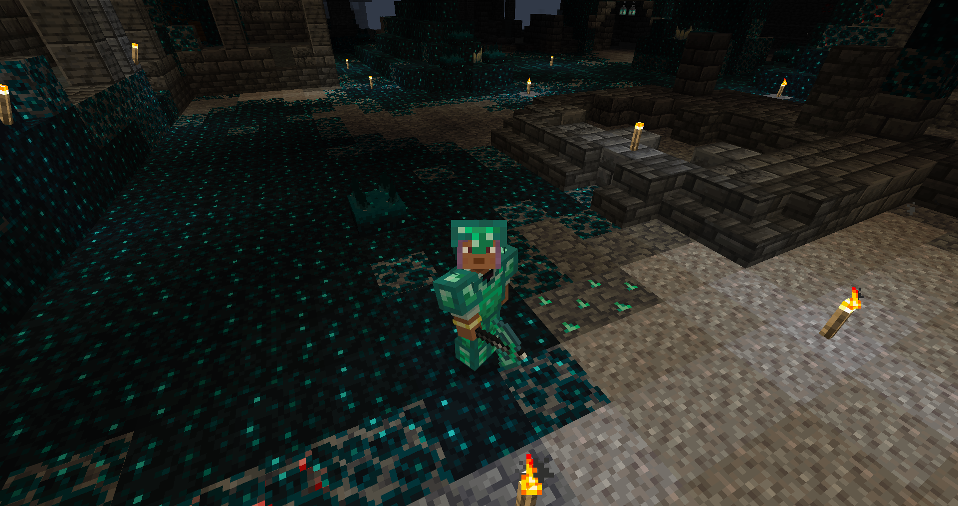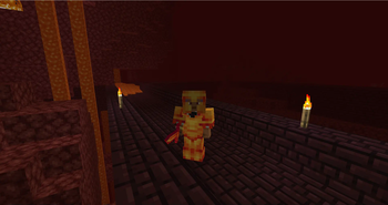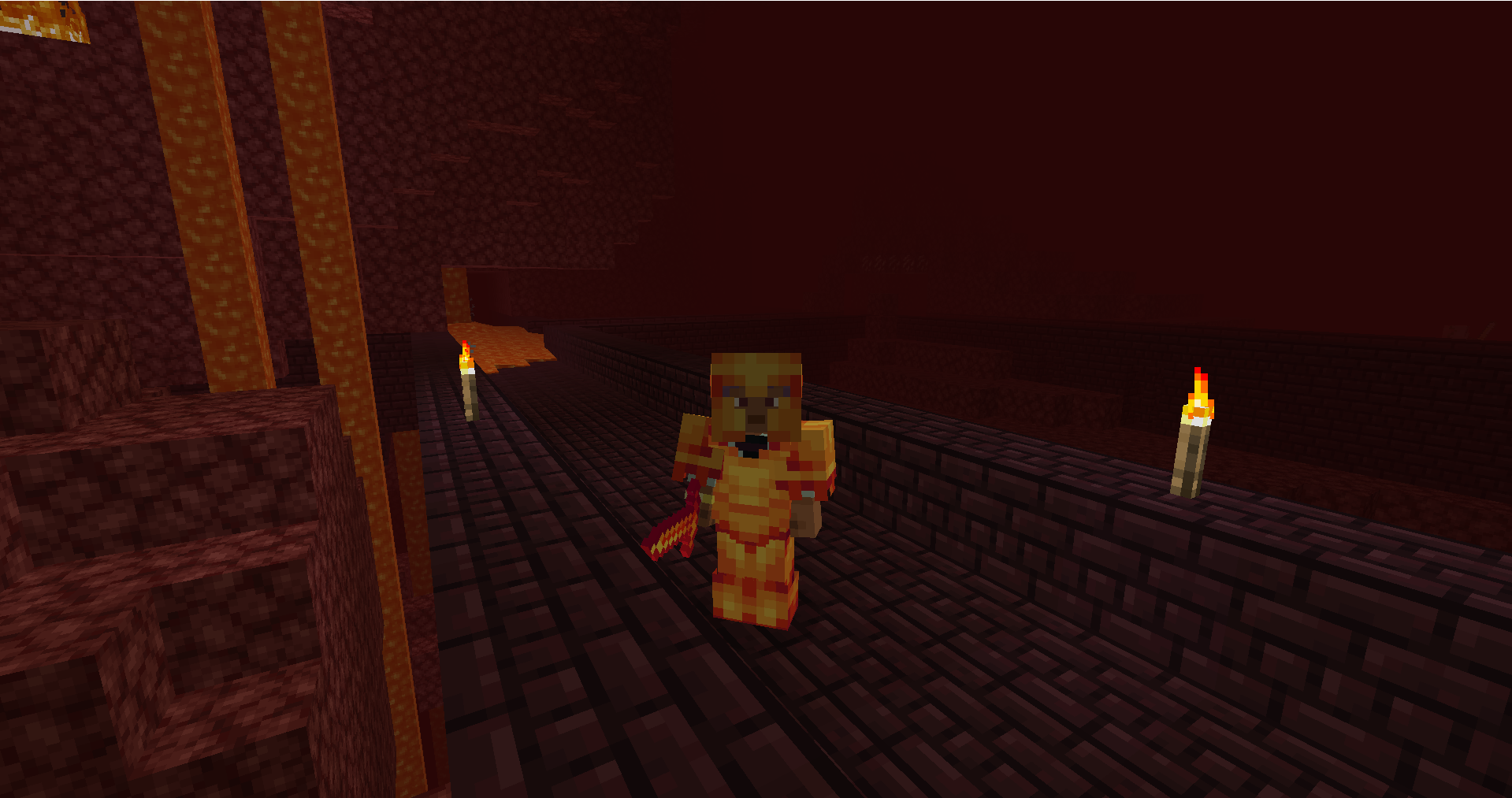 The player wearing Molten Armor and holding a Molten Sword in a Nether Fortress.
