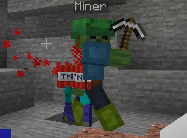 miner is an old-class mob migrated from v6, but it have skill now, it can summon small tnt zombie, you need to deal with the small tnt zombie first or they will explode (only damage) when times up. miner spawn in overworld below 40 height. loot: raw coppe