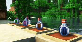 The line up of potion bottles, from splash potions to lingering potions to regular potions.