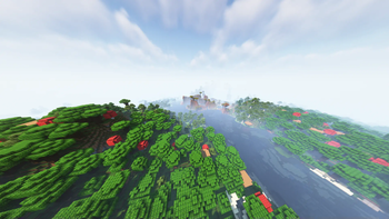 A flowing river between 2 forests, red mushrooms dot the cover, shot with complementary shaders