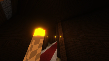 A hallway in the woodland mansion lit by torches, shot with complementary shaders