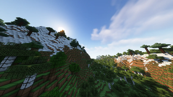 Sunrise over a snowy mountain, a valley below, shot with complementary shaders
