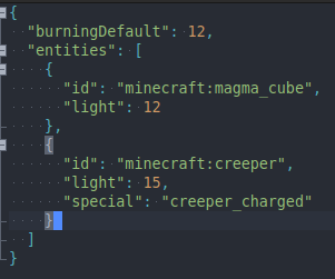 - "burningDefault": Определяет уровень света/яркости, который должен излучать горящее существо. Это глобальный параметр, влияющий на все горящие существа.
