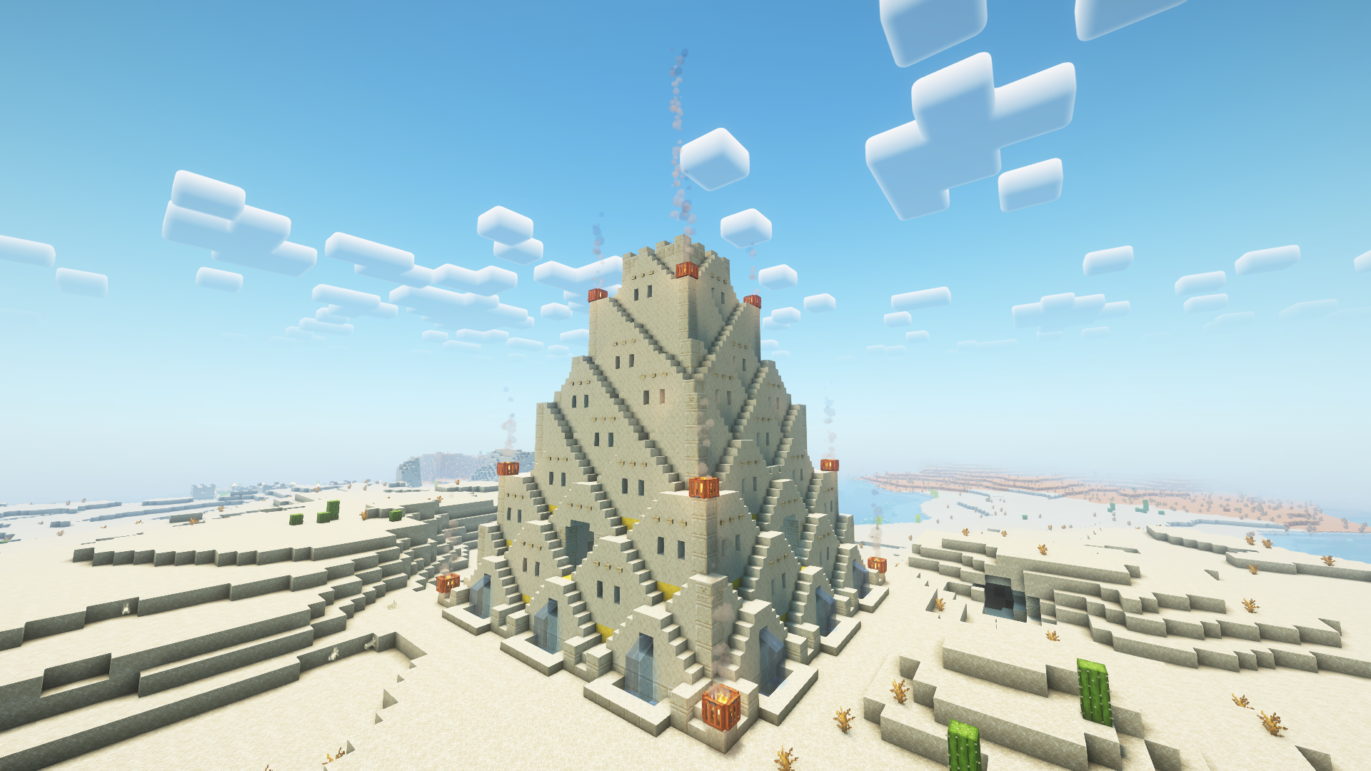 Храмовый комплекс включает в себя жилые помещения, торговые площади и ритуальные залы, создавая атмосферу настоящей древней цивилизации в мире Minecraft.