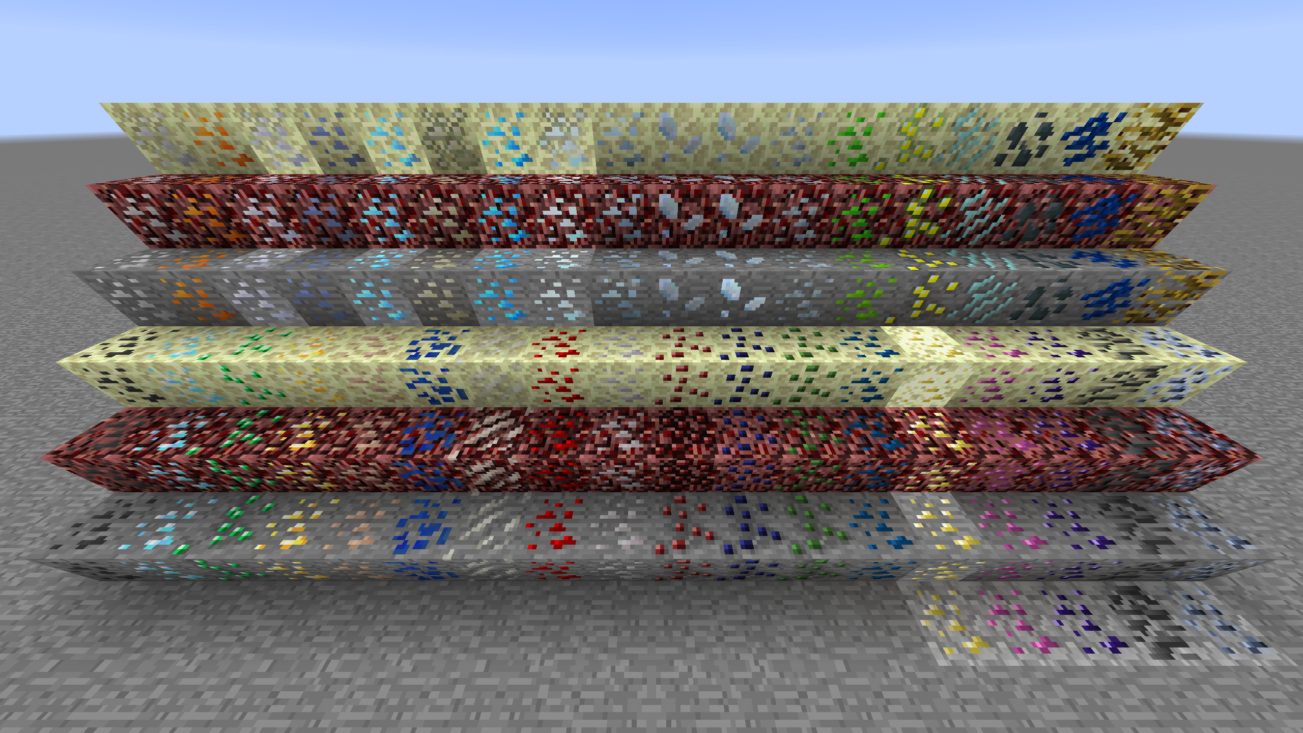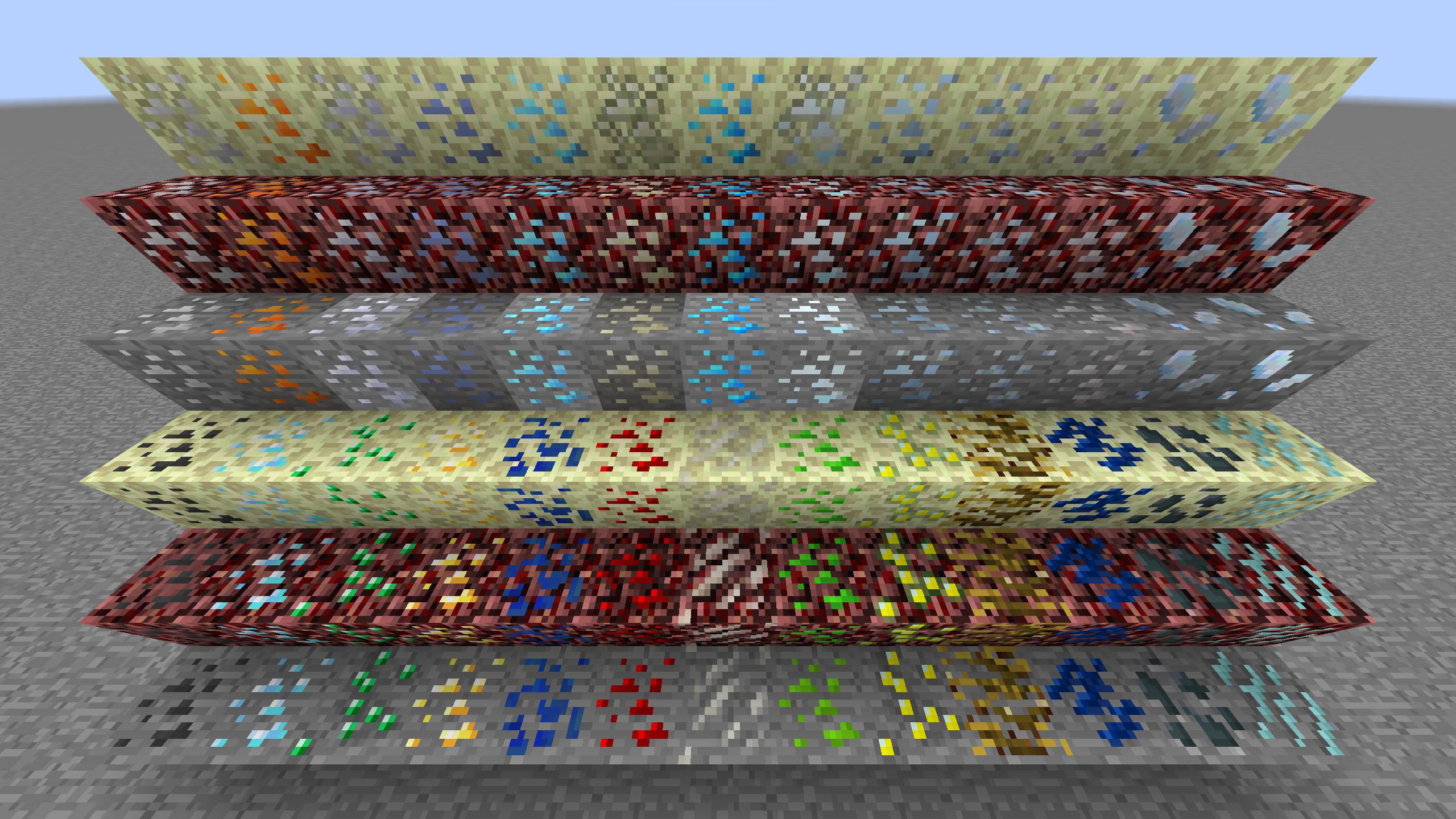 Shows the complete content from version 1.1 of the mod. Also shows the original ores that the additional ones are based off.