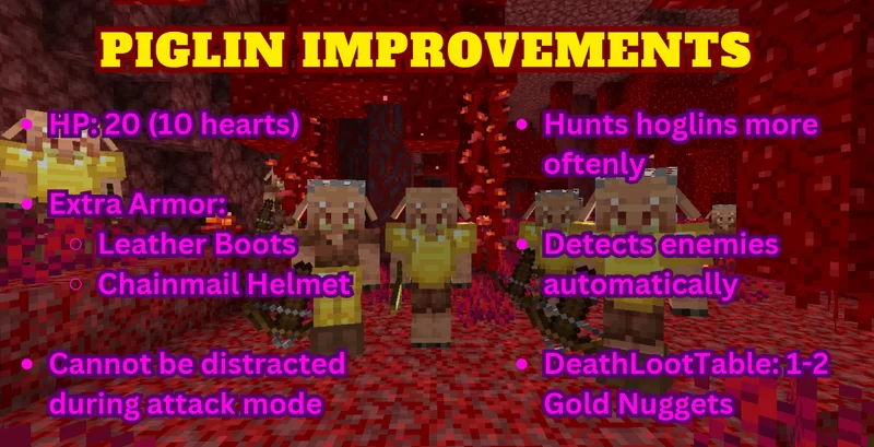 Этот датапак кардинально меняет поведение и характеристики пиглинов, возвращая им изначально задуманную балансировку. Модификация поддерживает версии Minecraft с 1.16.2 по 1.21.3.