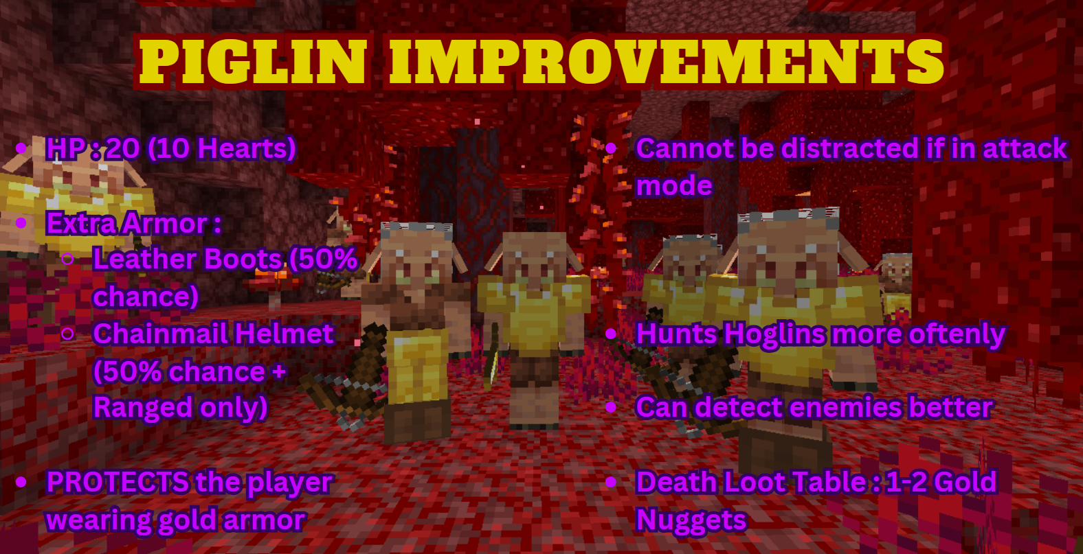 Основные изменения затрагивают бойцов-пиглинов, которым возвращено их первоначальное здоровье. Также значительно усилено снаряжение и вооружение этих враждебных мобов Незера.
