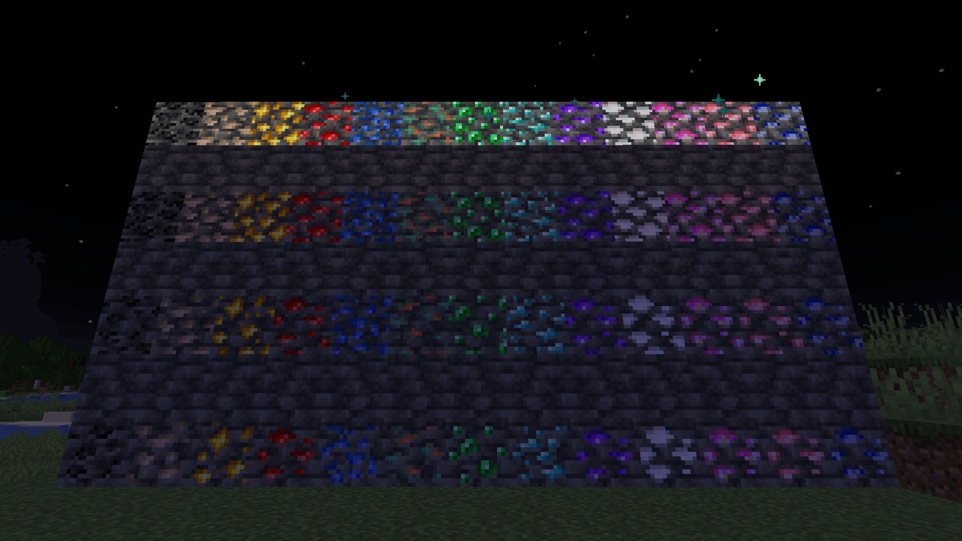 On the bottom are regular deepslate ores, above are the dense ores, and above those are super ores, and on top are the shining orrons.